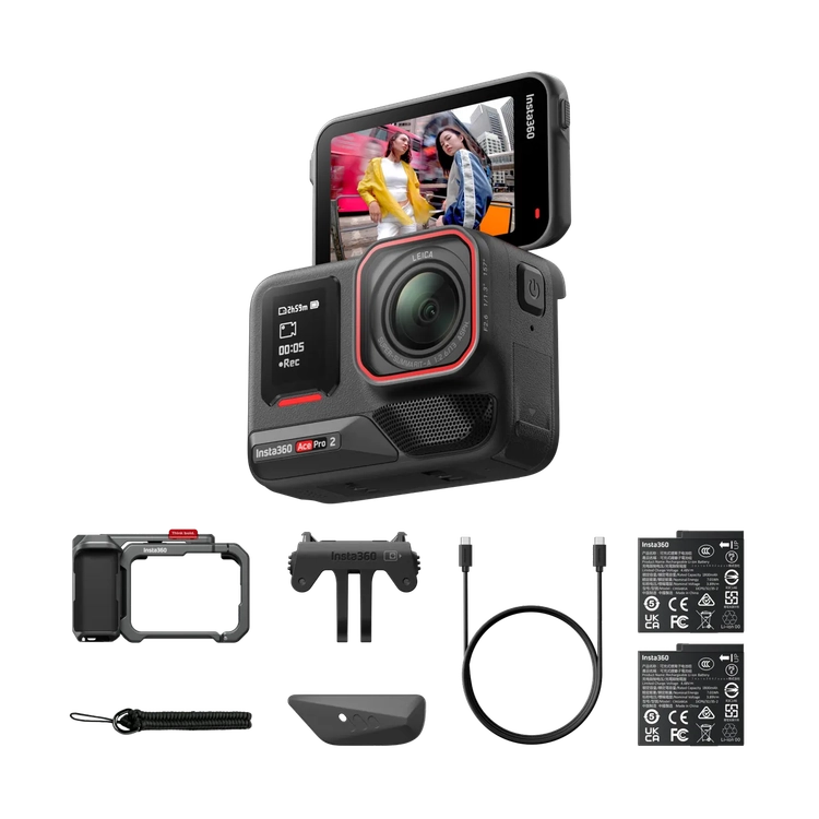 : 1x Insta360 Ace Pro 2, 1x 윈드 가드(카메라에 사전 장착됨), 2x 배터리, 1x 표준 마운트, 1x 마이크 캡, 1x USB-C 케이블, 1x 그립, 1x 유틸리티 프레임, 1x 콜드슈 셔터 버튼, 1x 장식용 콜드슈 캡, 1x 손목 스트랩.