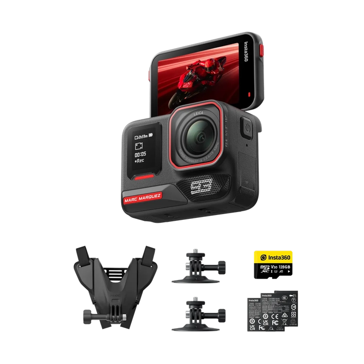 마르크 마르케스 에디션 구성품: 1x Insta360 Ace Pro 2, 1x 윈드 가드(카메라에 사전 장착됨), 2x 배터리, 1x 표준 마운트, 1x 마이크 캡, 1x USB-C 케이블, 1x 128GB microSD 카드, 1x 헬멧 턱 마운트 2.0, 2x 플렉시블 접착 마운트, 1x 사전 인쇄된 마크 마르케스 사인.