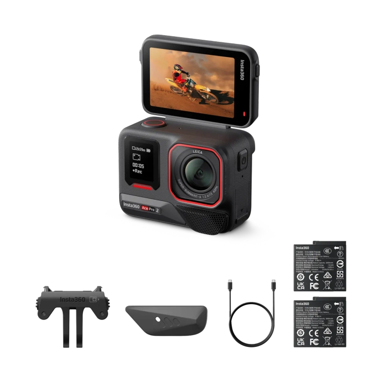 ※ 표준 번들 구성: Insta360 Ace Pro 2 x1, 윈드 가드(카메라에 사전 장착됨) x1, 배터리 x2, 표준 마운트 x1, 마이크 캡 x1, USB-C 케이블 x1